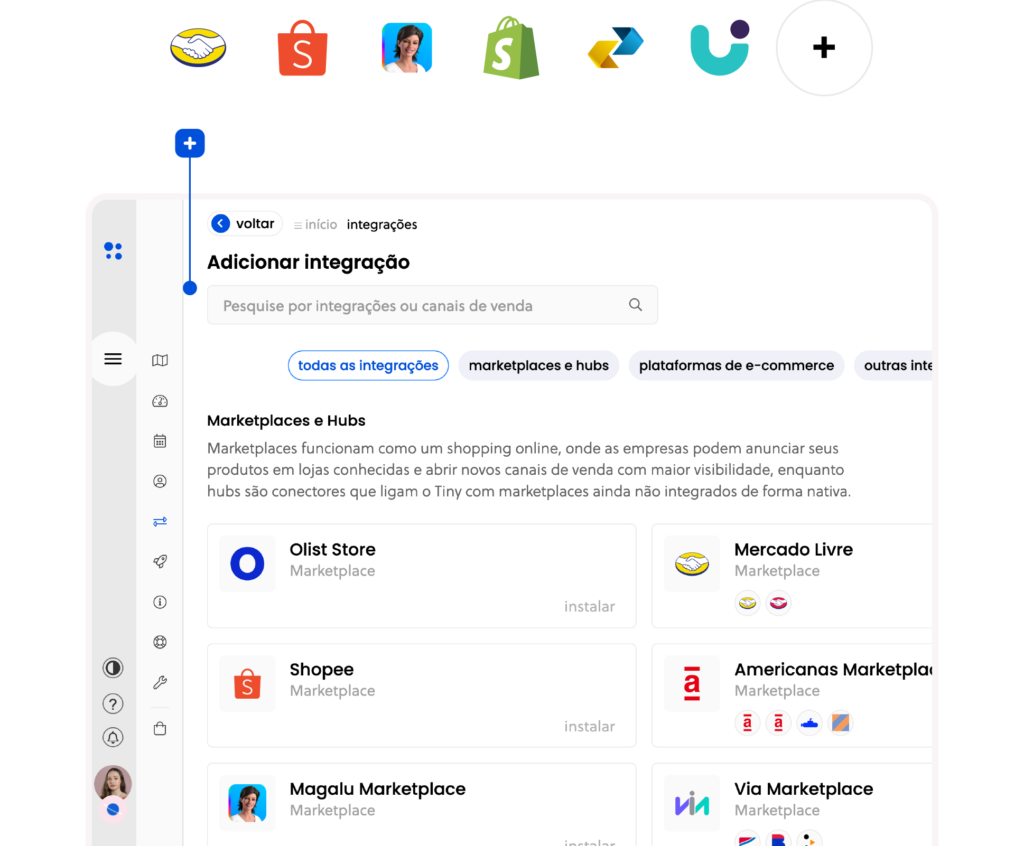 Conecte seu e-commerce a ERPs, Google Analytics, Meta Pixel, WhatsApp, marketplaces e mais para ampliar seu alcance e monitorar resultados.